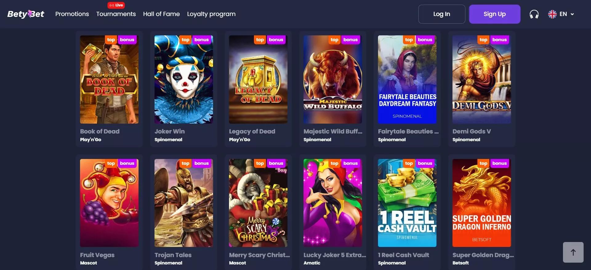 De Betybet casino online spellen bestaan vooral uit heel veel slots. Daarmee weet het zich te onderscheiden, want er zijn duizenden spellen. Dit is aangevuld met tafelspellen en een goed live casino. Speel bij Betybet online casino voor echt geld, maar vergeet ook zeker niet om eerst gratis software te proberen.