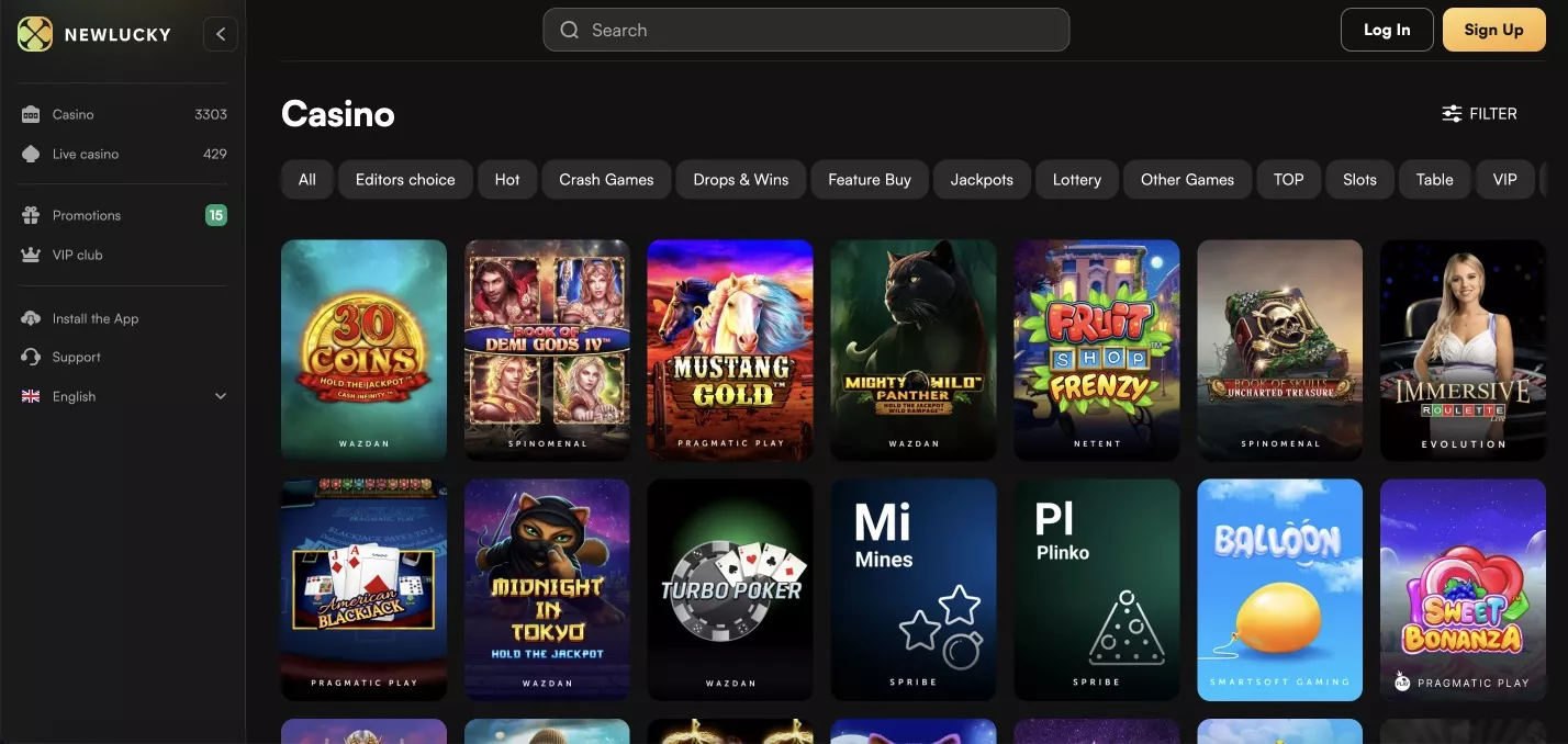 NewLucky software is er onder meer in de vorm van slots, tafelspellen en een live casino. De spellen zijn afkomstig van onder meer NetEnt, Hacksaw Gaming en Pragmatic Play. Daarbij is er ook een bescheiden aanbod aan overige spellen zoals scratch cards. Uit de