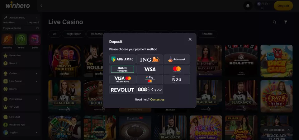 Voor het maken van een storting zijn er voldoende methoden om uit te kiezen. Uiteraard gaan we in deze recensie van WinHero casino online in Nederland in 2025 kijken naar welke methoden er beschikbaar zijn voor stortingen en opnames. Let er daarbij goed op dat je minimaal 20 euro over kunt maken en tot maximaal 5.000 euro per transactie kunt storten. Het minimale bedrag voor opnames is 40 euro en je kunt tot 20.000 euro per transactie laten uitbetalen. Dit zijn de populairste betaalmethoden: